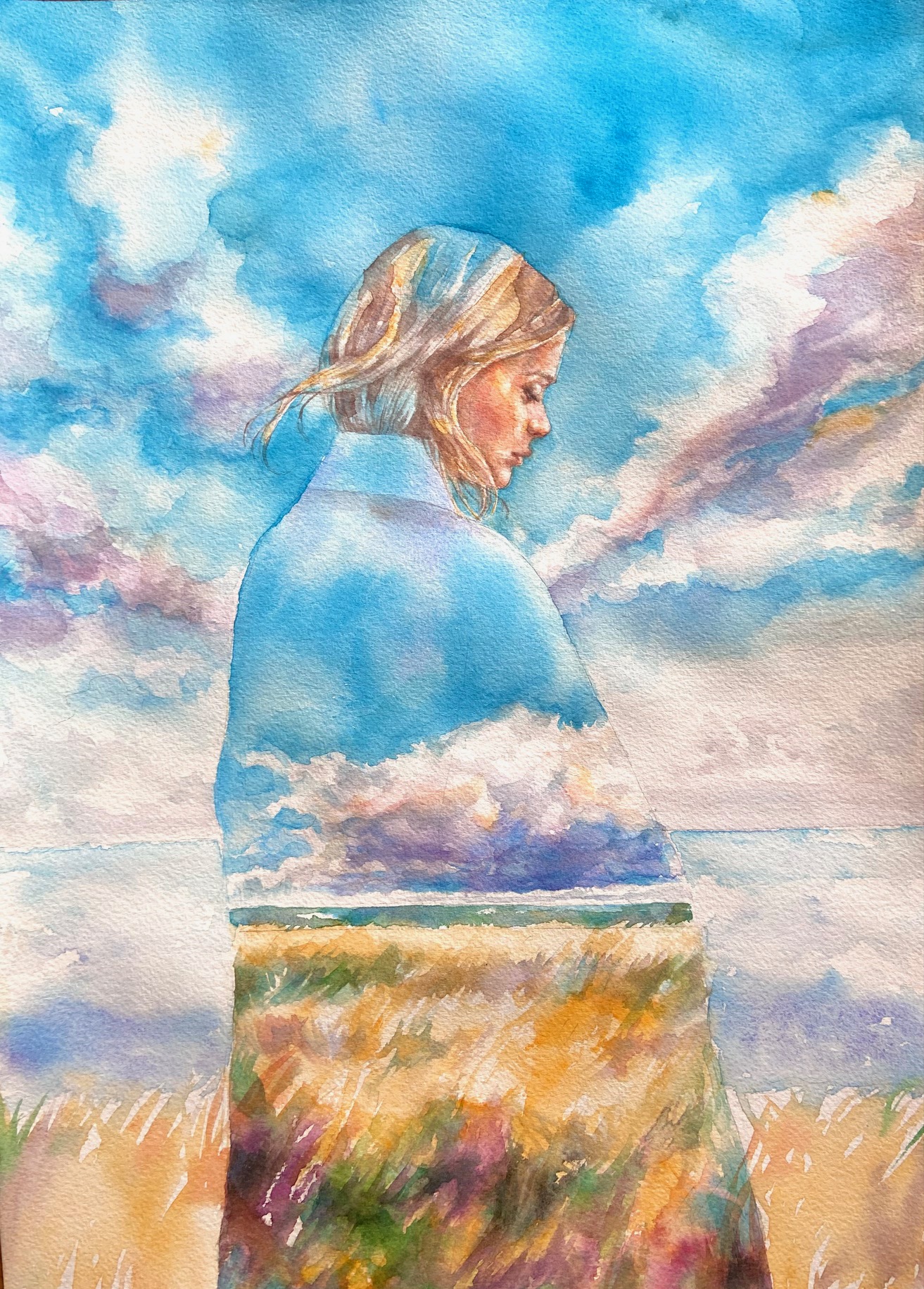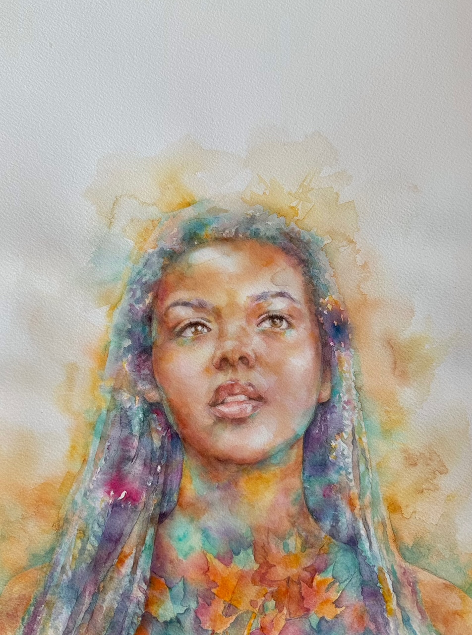 “The Song in Her Eyes”, 16×20″ matted and framed watercolor, $600